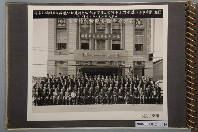 1.本物件為民國51年(1962)3月18日臺灣合會儲蓄公司宜蘭分公司新建辦公廳落成剪綵紀念合影之黑白照片。照片地點為宜蘭分公司前,公司員工排成四排,第1排採坐姿,其餘3排站立,以及分公司門口上方懸掛歡迎黃董事長蒞臨剪綵布條,照片上方列有文字「歡迎黃董事長蒞臨臺灣合會儲蓄公司宜蘭分公司新建辦公廳落成剪綵攝影留念中華民國五十一年三月十八日」,載明拍照原因與日期。
