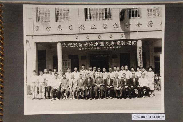 1.本物件為民國51年(1962)5月23日臺灣合會儲蓄股份有限公司歡迎劉董事長濶才紀念合影之黑白照片。照片地點為東勢分公司前,公司員工排成兩排,第1排採坐姿,第2排站立,以及分公司門口柱子上貼有歡迎劉董事長濶才蒞臨字樣,公司門口前有說明業務內容的看板,照片上方列有文字「歡迎劉董事長闊才蒞臨留影紀念中華民國五十一年五月二十三日」,載明拍照原因與日期。