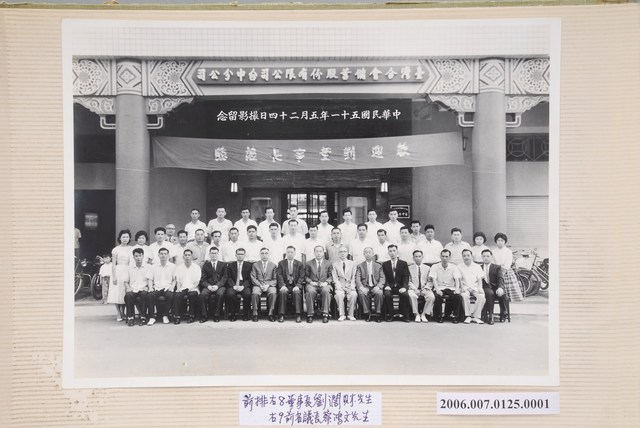 1.本物件為民國51年(1962)5月24日台灣合會儲蓄股份有限公司台中分公司歡迎劉董事長蒞臨之黑白相片。照片拍攝地點為台灣合會儲蓄股份有限公司台中分公司門口前,並掛有歡迎劉董事長蒞臨的紅布條,公司職員與劉闊才董事長及前省議會議長劉鴻文等人合照。照片前排右8為董事長劉闊才,前排右9為前省議會議長蔡鴻文。在歡迎紅布條上有載明拍攝日期「中華民國五十一年五月二十四日攝影留念」。照片下方有「前排右8董事長劉闊財(才)先生右9為錢省議長蔡鴻文先生」等註記。