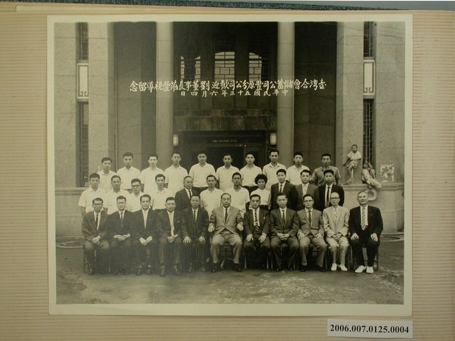 1.本文物為民國53(1964)年6月4日台灣合會儲蓄公司豐原分公司歡迎劉董事長之黑白照片。照片中央為公司職員在豐原分公司門口與劉闊才董事長合照,前排右6為劉闊才董事長。照片上有兩列文字,分別是「臺灣合會儲蓄公司豐原分公司歡迎劉董事長蒞豐視導留念」、「中華民國五十三年六月四日」。