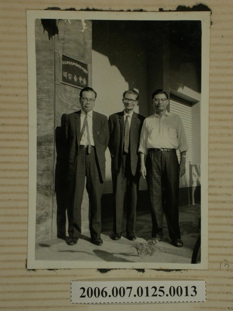 1.本物件為三人在台灣合會儲蓄股份有限公司台中分公司合照之黑白照片。照片中間有三名男子在台灣合會儲蓄股份有限公司台中分公司招牌前合照,中間及左邊男子著西裝打領帶,右邊男子著襯衫。
