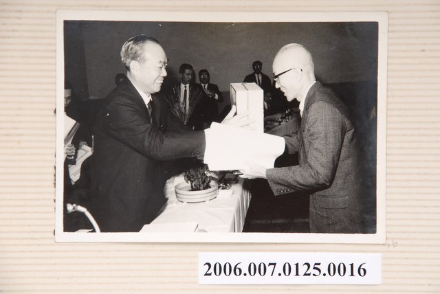 1.本物件為台灣合會儲蓄股份有限公司劉闊才董事長頒獎之黑白照片。照片中間為劉闊才頒獎給公司員工,照片後方有數名員工站立或坐著。