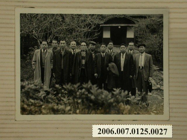 本物件為眾人合照之黑白照片,11名男子交錯站立面向鏡頭,有穿著西裝也有穿著風衣者,顯示該地區氣溫較低或拍攝時為冬季。照片後方有一棟日式建築,兩旁有樹木,前有灌木叢。