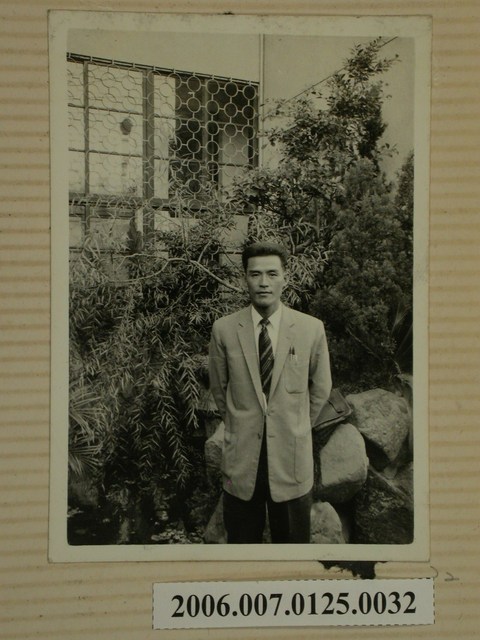 本物件為1名男子在建築物前獨照之黑白照片,照片中間有1名男子穿著西裝面對鏡頭,背景為建築物造景。造景有樹木及日式燈座。