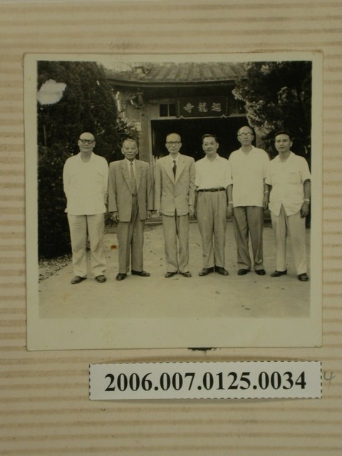 本物件為6名男子在迎龍寺前合照之黑白照片,照片中6人排成一列面對鏡頭,除左2與左3穿著西裝外,其餘穿著襯衫。照片後方為迎龍寺的匾額。