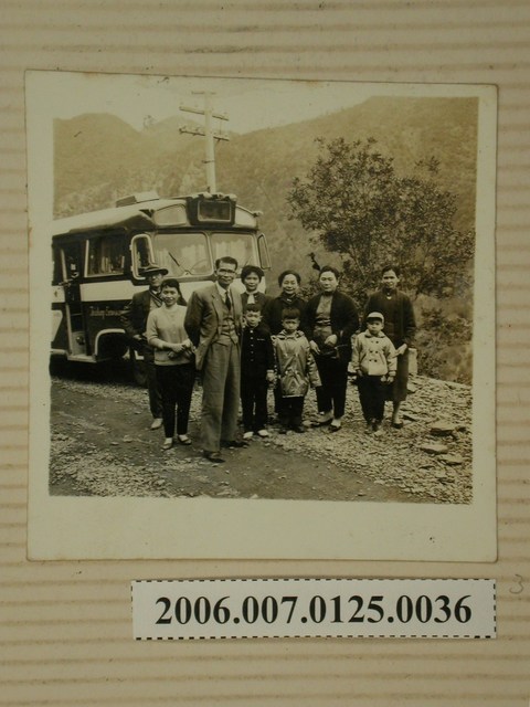 本物件為眾人在路邊與公車合照之黑白照片,照片中央為為10人站在公車前合照,照片中有3名孩童,5名女性,2名男性。眾人均面對鏡頭,背景為一臺公車,遠方為山巒。