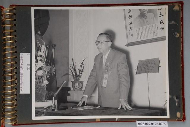 此為一黑白照片,為陳錫卿於1957年當選第三屆彰化縣長時的就職典禮中,陳錫卿致詞的畫面,地點為舊彰化縣政府禮堂,現已不存。 此物件所提及的主要人物為陳錫卿,1907年出身南投竹山,在1933年開始,先後進入滿州國以及上海汪精衛政府任職。1948年在臺灣參加於臺北舉辦的「臺灣省縣長考試」,37人應試,僅有陳錫卿、何舉凡、林伏濤3人入選,3人中僅陳錫卿為臺灣人,同年4月2日陳錫卿被任命為彰化市長。在1950年彰化縣成立後,陳錫卿官派成為縣長,後在1951年辭退官派縣長投入選舉並當選第1屆民選縣長,1954年再次投入選舉並連任。陳錫卿在彰化縣長任內的重要政績為興建八卦山風景區並且修建八卦山大佛,後於1960年出任省政府民政廳廳長,並持續擔任到1966年。在1967年被指派為中國國民黨中央黨部副秘書長。