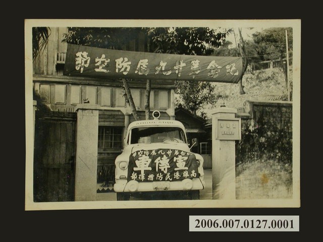 1.本物件為高雄港防空節宣傳車正要出發時所照的照片,照片中車子正要駛出高雄民防指揮部門口,門口掛有紀念第二十九屆防空節布條,車子引擎蓋上掛有一宣傳布條,布條上寫有「第二十九屆防空節 宣傳車 高雄港民防指揮部」字樣,車內坐著一名司機。 2.抗戰期間防空總監部以我國被敵軍轟炸之損失,慘重異常,實因我國防空設備未達完善,乃請定「防空節日」,奉國民政府明令規定以每年11月21日為 「防空節」,其首屆於民國29年此日在全國各地同時舉行。