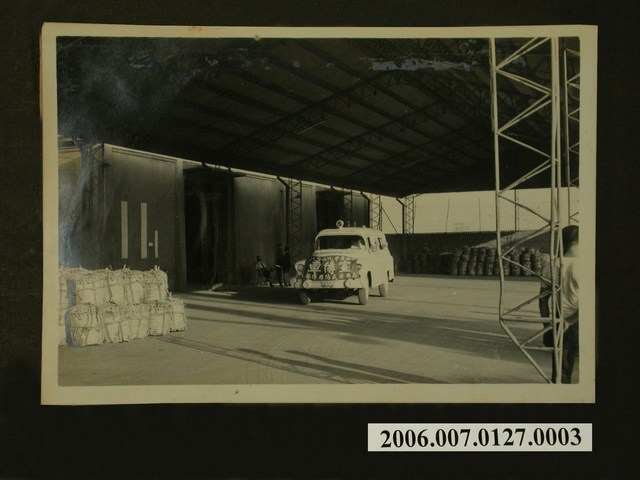 1.本物件為高雄港防空節宣傳車深入香蕉棚宣傳照片,車子停放位置旁推測應為碼頭倉庫,一旁還有許多袋裝並用繩子綁好成堆的貨物堆放於此。 2.抗戰期間防空總監部以我國被敵軍轟炸之損失,慘重異常,實因我國防空設備未達完善,乃請定「防空節日」,奉國民政府明令規定以每年11月21日為 「防空節」,其首屆於民國29年此日在全國各地同時舉行。