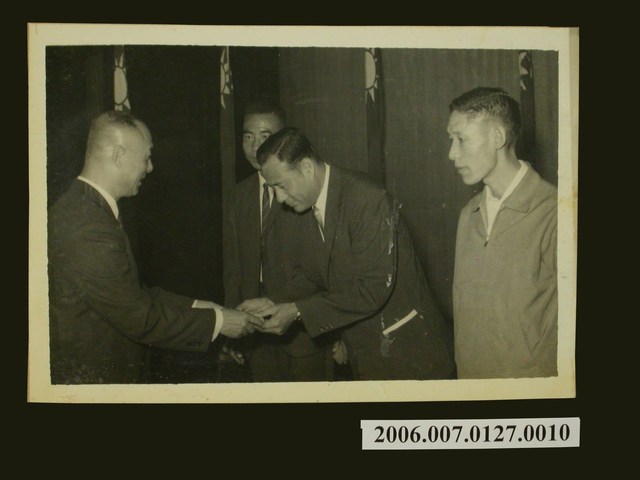 1.本物件為高雄港防空節紀念會上頒發防護設備管理績優人員獎照片,照片中有三位男性正在等待授獎,左方男性正在頒獎予中間的男子,後方有一排中華民國國旗。 2.抗戰期間防空總監部以我國被敵軍轟炸之損失,慘重異常,實因我國防空設備未達完善,乃請定「防空節日」,奉國民政府明令規定以每年11月21日為 「防空節」,其首屆於民國29年此日在全國各地同時舉行。
