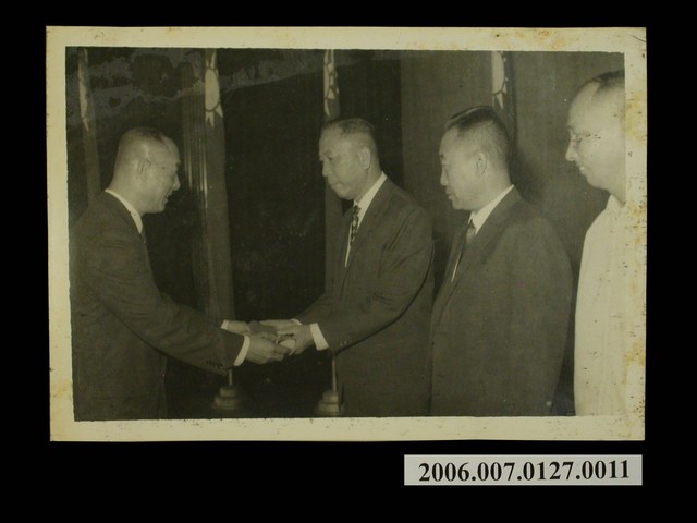 1.本物件為高雄港防空節紀念會上頒發防護設備管理績優單位獎照片,照片中有三位男性正在等代授獎,左方男性正在頒獎予右方數來第三位男性,後方有一排中華民國國旗。 2.抗戰期間防空總監部以我國被敵軍轟炸之損失,慘重異常,實因我國防空設備未達完善,乃請定「防空節日」,奉國民政府明令規定以每年11月21日為 「防空節」,其首屆於民國29年此日在全國各地同時舉行。
