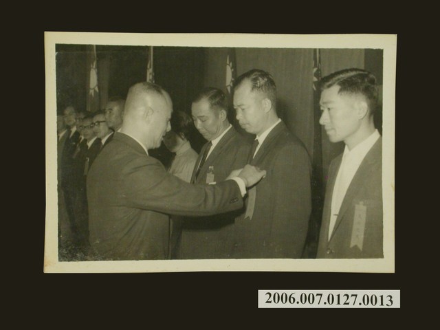 1.本物件為高雄港防空節紀念會上兼指揮官轉頒「民防之光」徽章的照片,照片中兼指揮官將徽章別於右二男子的左胸前。 2.抗戰期間防空總監部以我國被敵軍轟炸之損失,慘重異常,實因我國防空設備未達完善,乃請定「防空節日」,奉國民政府明令規定以每年11月21日為 「防空節」,其首屆於民國29年此日在全國各地同時舉行。