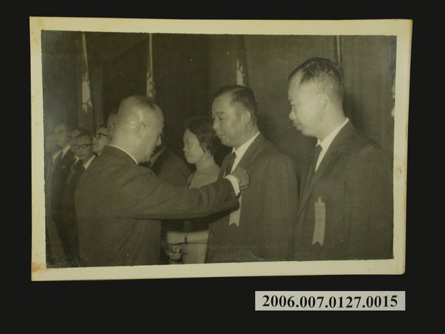 1.本物件為高雄港防空節紀念會上兼指揮官轉頒「民防之光」徽章照片,照片中兼指揮官只將徽章別於右二男子的左胸前,右一男子轉頭注視,後方為一排中華民國國旗。 2.抗戰期間防空總監部以我國被敵軍轟炸之損失,慘重異常,實因我國防空設備未達完善,乃請定「防空節日」,奉國民政府明令規定以每年11月21日為 「防空節」,其首屆於民國29年此日在全國各地同時舉行。