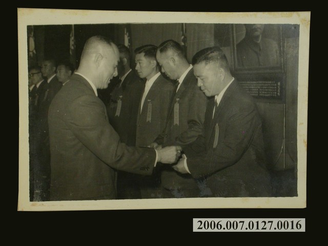 1.本物件為高雄港防空節紀念會上兼指揮官轉頒「民防之光」徽章照片,照片中兼指揮官將獎項頒發給右一男子,其後方有國父遺像及一排中華民國國旗。 2.抗戰期間防空總監部以我國被敵軍轟炸之損失,慘重異常,實因我國防空設備未達完善,乃請定「防空節日」,奉國民政府明令規定以每年11月21日為 「防空節」,其首屆於民國29年此日在全國各地同時舉行。