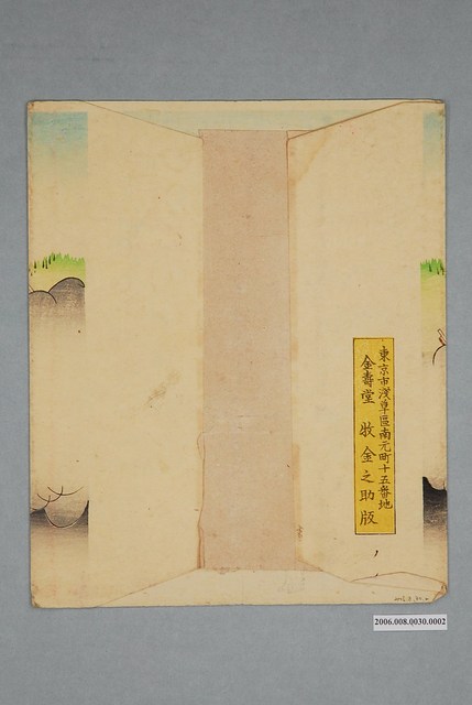 1. 牧金之助作〈臺灣征討壽伍祿〉於明治28年11月00日印刷,內容併有25件浮世繪(戰爭繪)。本件為書套一只。2. 日清戰爭錦繪為日本在日清戰爭時期(西元1894至1895年)所出版的浮世繪作品,畫作的主題與題材皆與戰爭戰場之情形有關。3. 本件保存狀態良好,僅四周有些微磨擦痕跡。