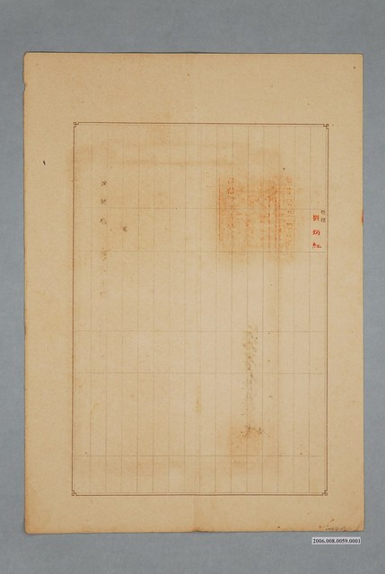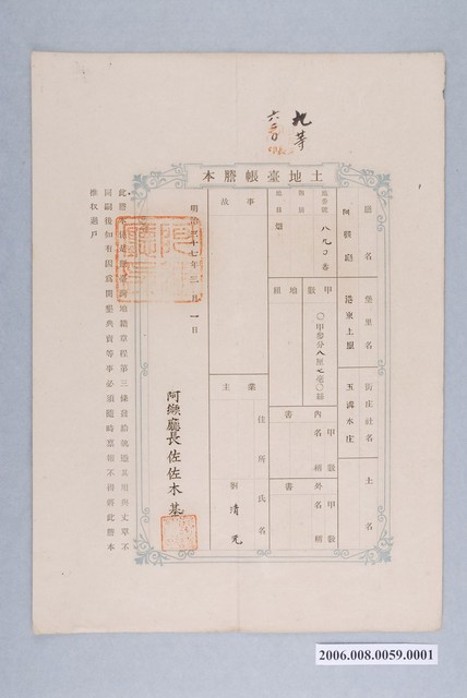 業主劉清元申請之土地臺帳謄本,由阿猴廳長佐佐木基發給,土地位置在阿猴廳港東上里五溝水庄八九〇番地(位於今日屏東縣萬巒鄉)。地目為畑(旱田),面積叁分八厘七毫〇絲,管理人劉炳紅,發給日期為明治37(1904)年3月1日。蓋有關防「阿猴廳印」及官印「阿猴廳長印」。
