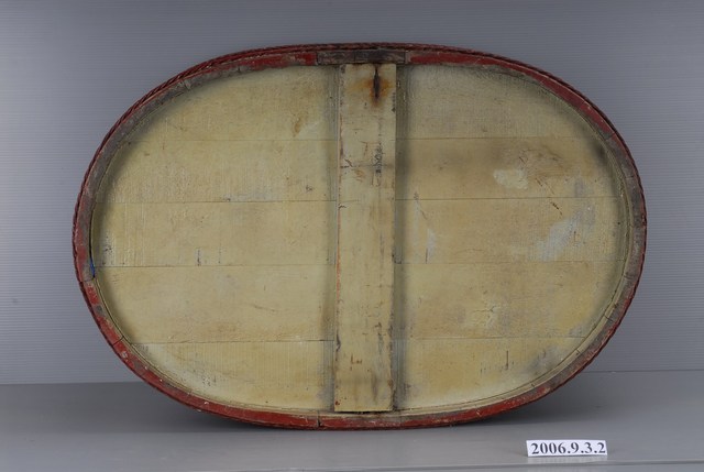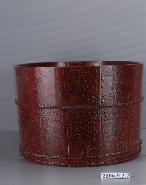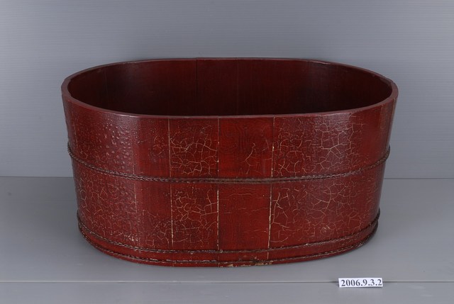 本文物為嬰兒用澡盆,木質,紅色油漆,外面綁著箍繩,用以固定木板拼裝的澡盆,上方有盆蓋,可以防止洗澡或打水時熱水溢出。嬰兒澡盆為早期母親為嬰兒洗澡所使用,因盆高較淺因此適合嬰兒使用。