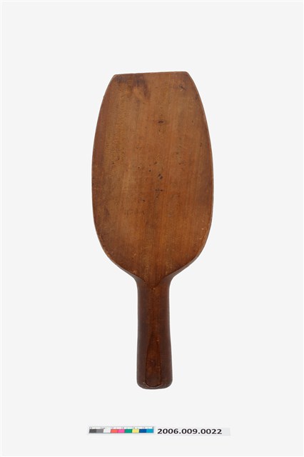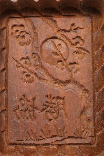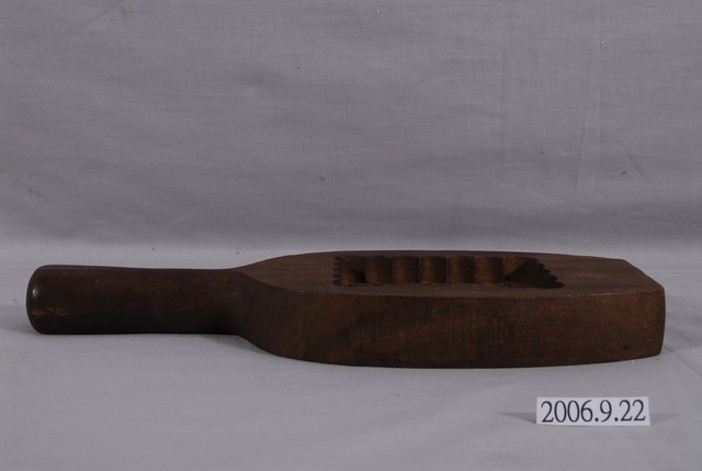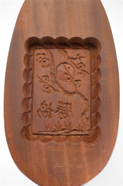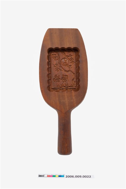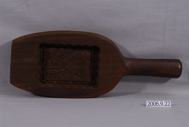 2006.009.0022 六甲協勝酒瓶形單面雕花草滿月紋帶柄餅印