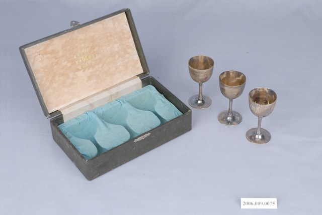 本件荒井商店製昭和13年虎尾郡防風林造成紀念盒裝鍍銀銅杯可分為收納盒、以及3支鍍銀銅杯。日治時期日本在臺灣進行各種地方建設,日本政府習慣於建設落成或是紀念重要事物時,製作紀念品致贈相關人士,常以徽章、金屬盤、杯等,種類繁多。臺灣西部沿海冬季時會有強烈的東北季風吹襲,導致砂眼以及農作物損害,日本政府在臺南州的北港郡與虎尾郡計畫性設置防風林以改善東北季風的影響。其種植的樹種為至今仍然常見的黃麻木與福木。