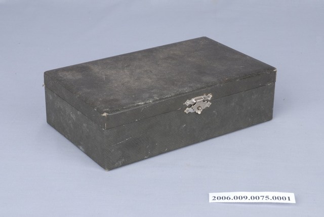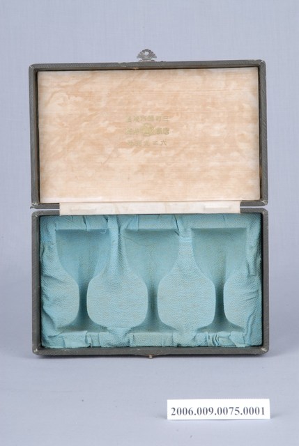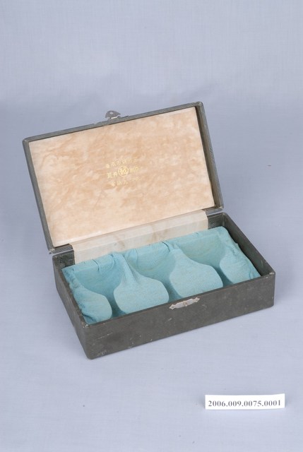 本件收納盒為井商店製昭和13年虎尾郡防風林造成紀念盒裝鍍銀銅杯之部件1,長18公分,寬11.4公分,高5.4公分呈木製長方形扁盒狀。盒身表面以綠色仿皮革布料包覆,盒蓋作上掀式,長邊一側以絞鍊固定,正面作金屬鎖扣。內層將鍍銀銅杯之剖面外形切割後,作嵌入式凹槽固定,表面覆蓋淡藍色布料作襯。蓋身內側以白色絹布作襯,中央以金色墨水印有臺南市錦町三,荒川商店,其商標為圓環形內印「越」字樣作註冊商標,下端為電話九二六。