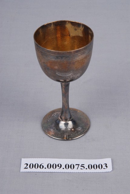 本件鍍銀銅杯為井商店製昭和13年虎尾郡防風林造成紀念盒裝鍍銀銅杯之部件3,呈長3.8公分,寬3.8公分,高7.8公分。通身以銅金屬製作,表面鍍上銀金屬材質,外觀呈銀灰色,部分以露出黃銅色澤。銅杯器形呈高腳圓酒杯樣式,杯體呈蛋形上寬下窄樣式,圜底下接高足,足底作外撇圓盤。杯身接近口緣處作卷葉紋裝飾,下端打印虎尾郡防風林造成紀念,昭和十三年。