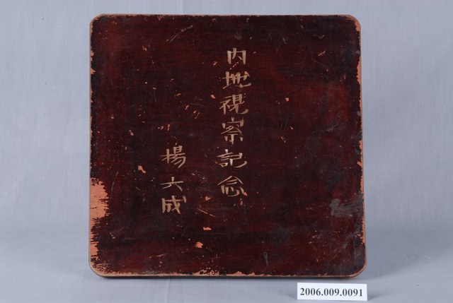 1.本件以單塊木頭刨削雕磨出一體成形的正方形漆盤。盤中雕鑿出正圓形的凹面,凹面中以線刻雕出「奈良」、兩隻鹿、塔寺建築等圖像與字樣,呈現該件物品所要表現的紀念意涵;圓形凹面四周有淺浮雕的花做裝飾。漆盤背面以線刻雕出「內地視察記念」、「楊大成」等字樣,說明製作此漆盤的用意和製作者。整體塗以棕色漆,因年代久遠,盤面體正面與背面周緣皆有些微磨損,背面些許汙漬,然整體保存狀況堪稱良好。2.此件背面雕刻有「內地」兩字,再加上正面的「奈良」字樣,可確知製作的年代為日本殖民統治時期;此外,從線雕構圖來看,推測應是呈現日本奈良福興寺五重塔的樣貌。