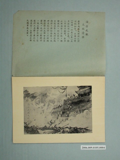 1. 本物件為鄭成功故事畫書冊〈海澄之戰大敗清軍〉,其繪畫書冊的形式為第1頁半透明薄紙印上故事文字,第2頁為黑白水墨風格的插畫。2. 本物件紙張有些許黃化情形,保存狀態尚佳。