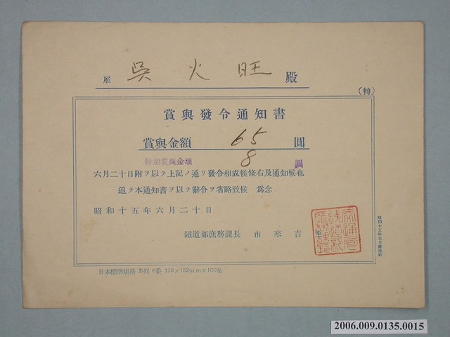 2006.009.0135.0015 昭和15年雇吳火旺獎賞通知書