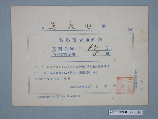 2006.009.0135.0016 昭和16年雇吳火旺獎賞通知書