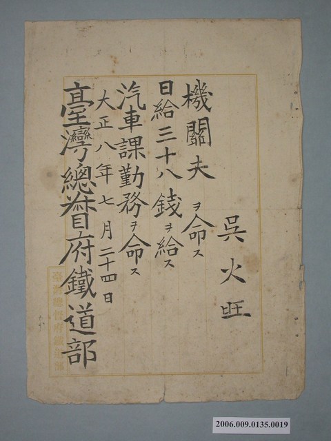 2006.009.0135.0019 大正8年臺灣總督府鐵道部機關夫吳火旺任命通知書
