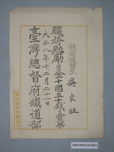 2006.009.0135.0021 大正8年臺灣總督府鐵道部機關練習生吳火旺職務勉勵金通知書