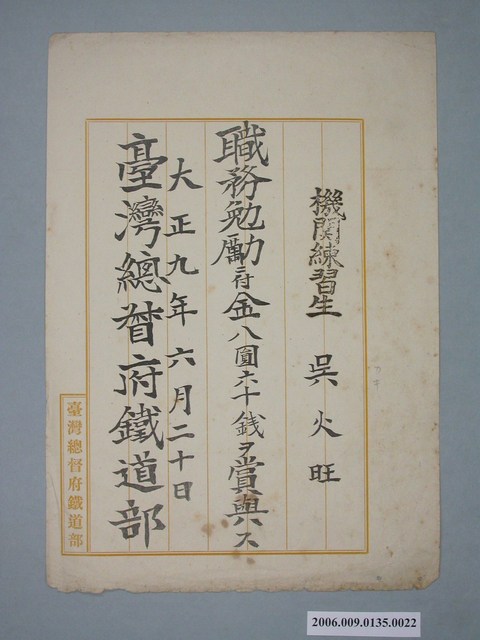 2006.009.0135.0022 大正9年臺灣總督府鐵道部機關練習生吳火旺職務勉勵金通知書