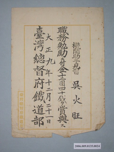2006.009.0135.0024 大正9年臺灣總督府鐵道部機關助手見習吳火旺職務勉勵金通知書