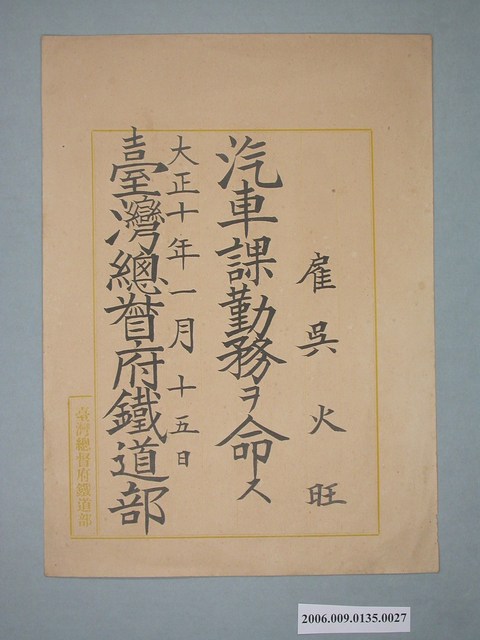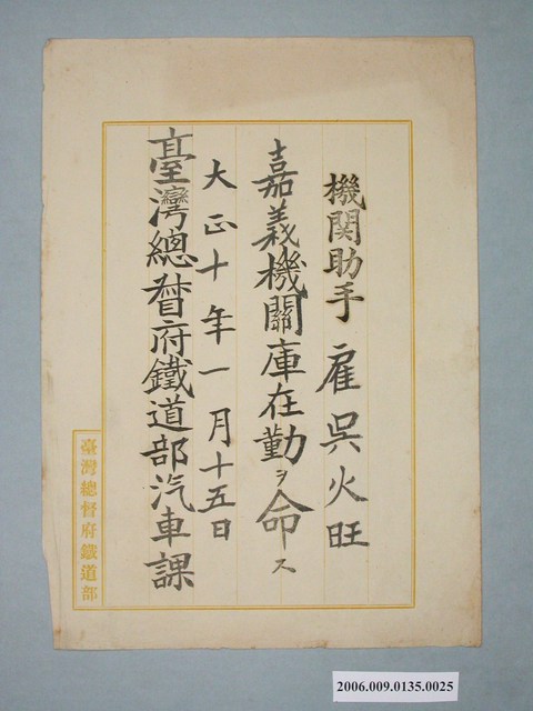 2006.009.0135.0027 大正10年臺灣總督府鐵道部汽車課雇吳火旺任命書