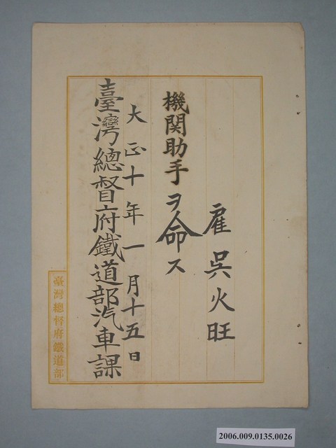 2006.009.0135.0026 大正10年臺灣總督府鐵道部汽車課雇吳火旺機關助手任命書