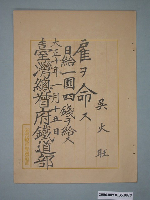 2006.009.0135.0028 大正10年臺灣總督府鐵道部雇吳火旺任命書