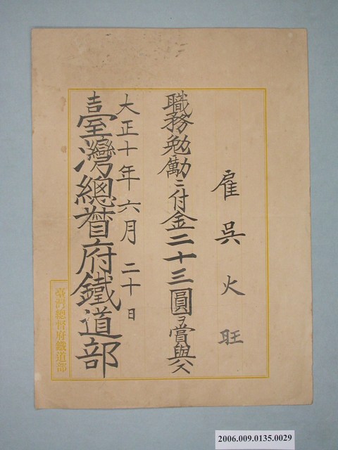 2006.009.0135.0029 大正10年臺灣總督府鐵道部雇吳火旺職務勉勵金通知書