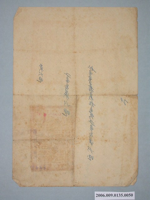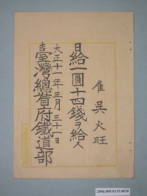 2006.009.0135.0031 大正11年臺灣總督府鐵道部雇吳火旺職務勉勵金通知書