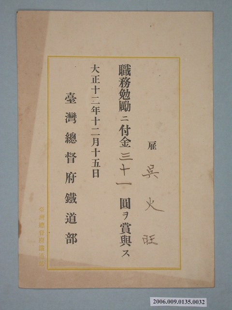 2006.009.0135.0032 大正12年臺灣總督府鐵道部吳火旺職務勉勵金通知書