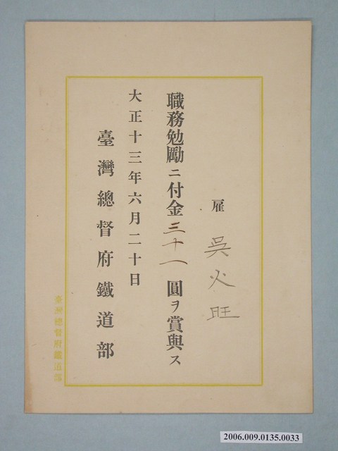 2006.009.0135.0033 大正13年臺灣總督府鐵道部吳火旺職務勉勵金通知書