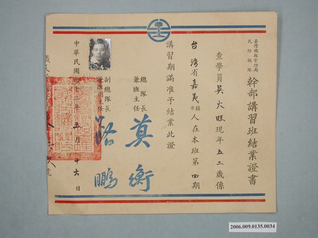 2006.009.0135.0034 民國42年臺灣鐵路管理局民防總隊幹部講習班結業證書