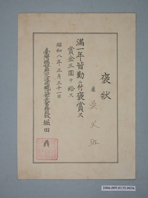 2006.009.0135.0036 昭和8年臺灣總督府交通局鐵道部雇吳火旺獎狀