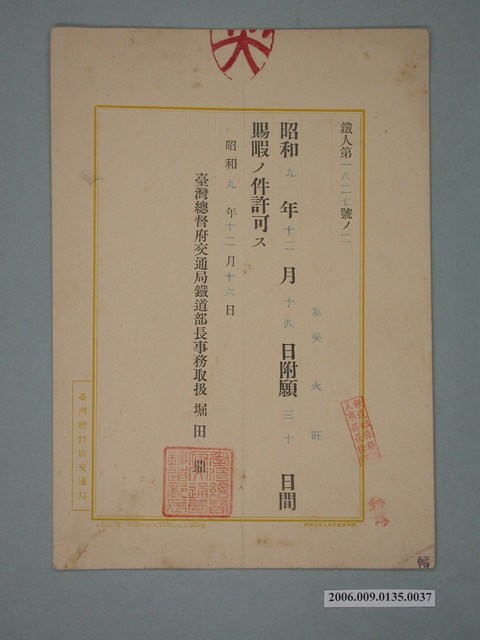2006.009.0135.0037 昭和9年臺灣總督府交通局鐵道部雇吳火旺休假許可書
