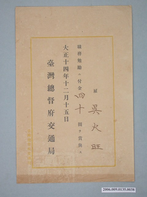 2006.009.0135.0038 大正14年臺灣總督府交通局雇吳火旺職務勉勵金通知書