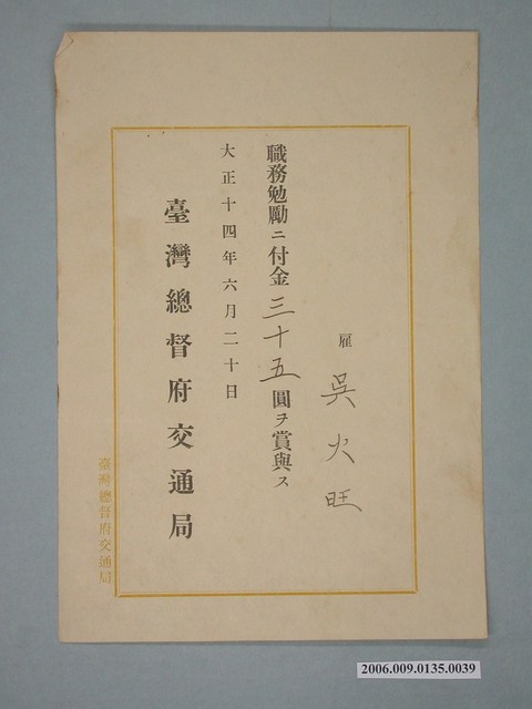 2006.009.0135.0039 大正14年臺灣總督府交通局雇吳火旺職務勉勵金通知書