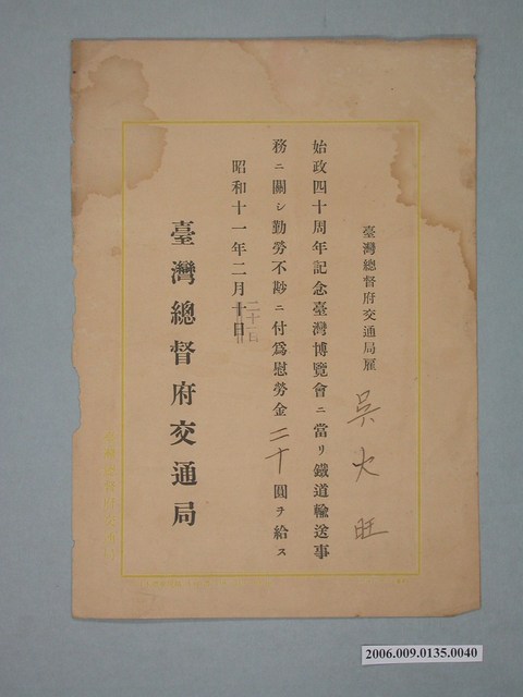 2006.009.0135.0040 昭和11年臺灣總督府交通局雇吳火旺慰勞金通知書