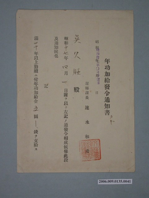 2006.009.0135.0041 昭和17年吳火旺年功加給發令通知書