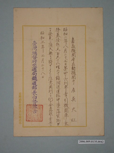 2006.009.0135.0042 昭和3年臺灣總督府交通局鐵道部嘉義機關庫在勤機關手吳火旺獎賞通知書