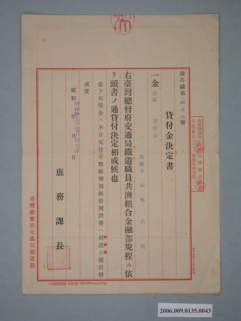 2006.009.0135.0043 臺灣總督府交通局鐵道部機關手雇吳火旺貸款額決定書