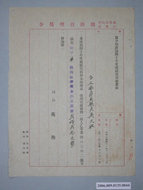 2006.009.0135.0044 民國41年臺灣省政府交通處鐵路管理局工務員兼股長吳火旺年度獎金通知書